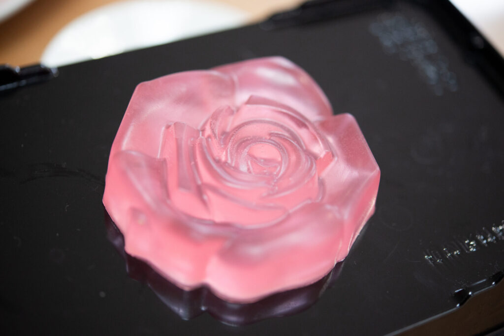 透き通ったバラの形が綺麗な色違いの石けんや、